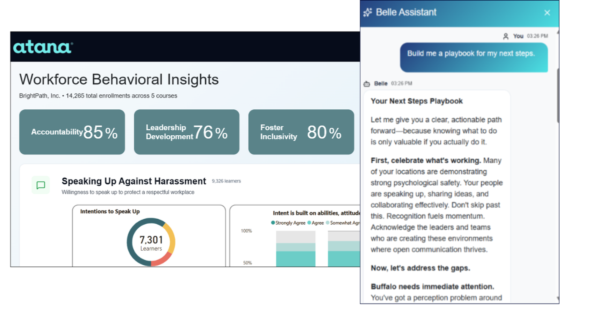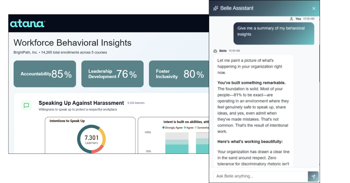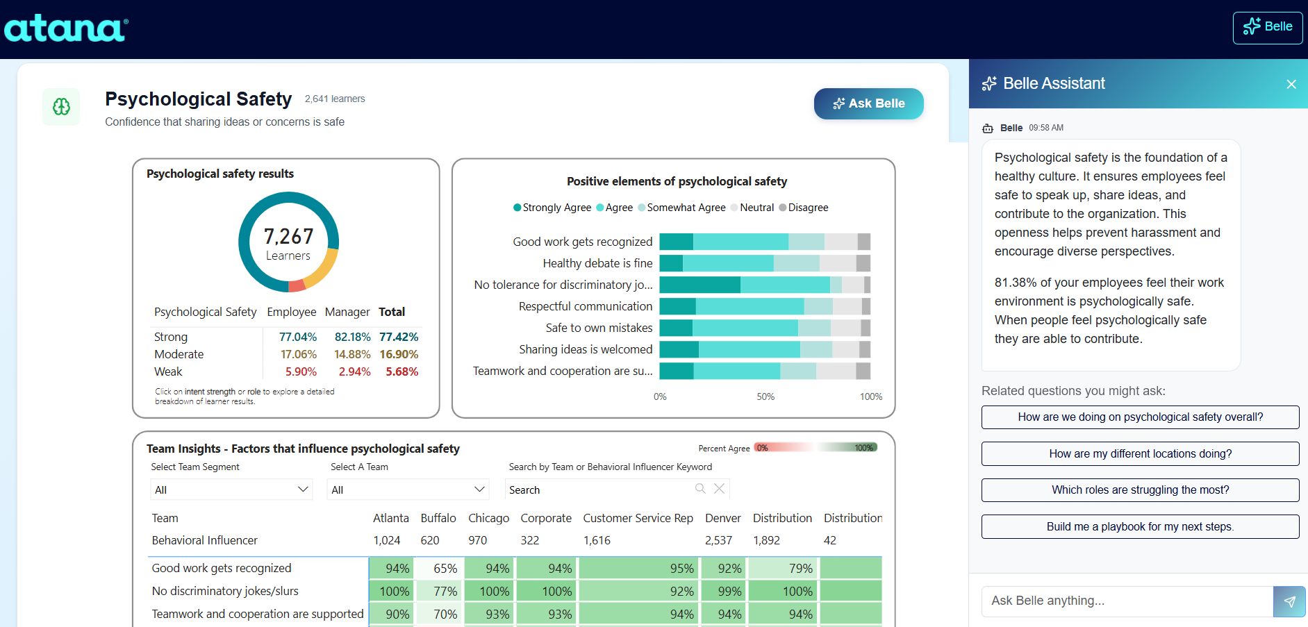 Belle, our AI Insights Assistant works with our Organizational Insights solution to help executives and learning leadership make sense of very rich data provided by Atana. Ask Belle to summarize the key highlights of your workforce behavioral insights and drill down into specific areas and detail to gain better insights into where you are doing well and what needs improvement.