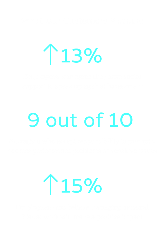 Complex behavioral data is translated into clear, actionable insights through intuitive dashboards that reveal employee beliefs, intent to act, and the underlying drivers of behavior. Dashboard provide granular drill-down by role, location, manager, or demographic, and are connect HRIS data, engagement surveys, or other datasets. This behavioral intelligence shows leaders exactly where to intervene and where development efforts are truly working.